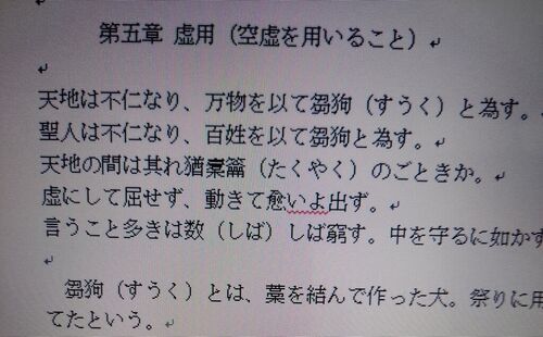 5 第五章 虚用(空虚を用いること)天地は不仁なり、万物を以て芻狗(すうく)と為す。聖人は不仁なり、百姓を以て芻狗と為す。天地の間は其れ猶槖籥(たくやく)のごときか。虚にして屈せず、動きて愈いよ出ず。言うこと多きは数(しば)しば窮す。中を守…