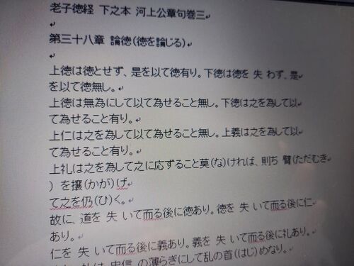 第三十八章 論徳(徳を論じる)上徳は徳とせず、是を以て徳有り。下徳は徳を 失 わず、是を以て徳無し。上徳は無為にして以て為せること無し。下徳は之を為して以て為せること有り。上仁は之を為して以て為せること無し。上義は之を為して以て為せること有り…