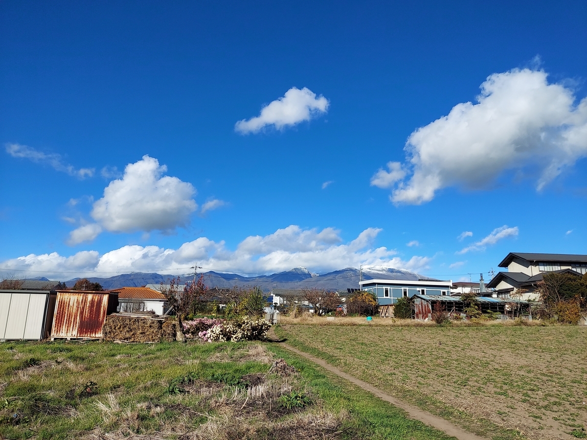 コンポーズグリーンと、エメラルドグリーンに下腹部を蔽われ、コンポーズブルーに胸部は際だち、コバルトバイオレットに頭部は染まり、水色の空に浮かぶ巻層雲の下、もこもことした積雲が、ところどころに影をグレーに落している山並みである。が、抜ける大気圏へと、幾筋もの雲が、三百六十度の空を流れてゆく。高峰・浅間の山並が北側に、物見山・荒船山が東側に、続く八ヶ岳の山々・・・・、蓼科高原が南に下方のなだらかな山々を抱えている。遥か彼方は北アルプス。