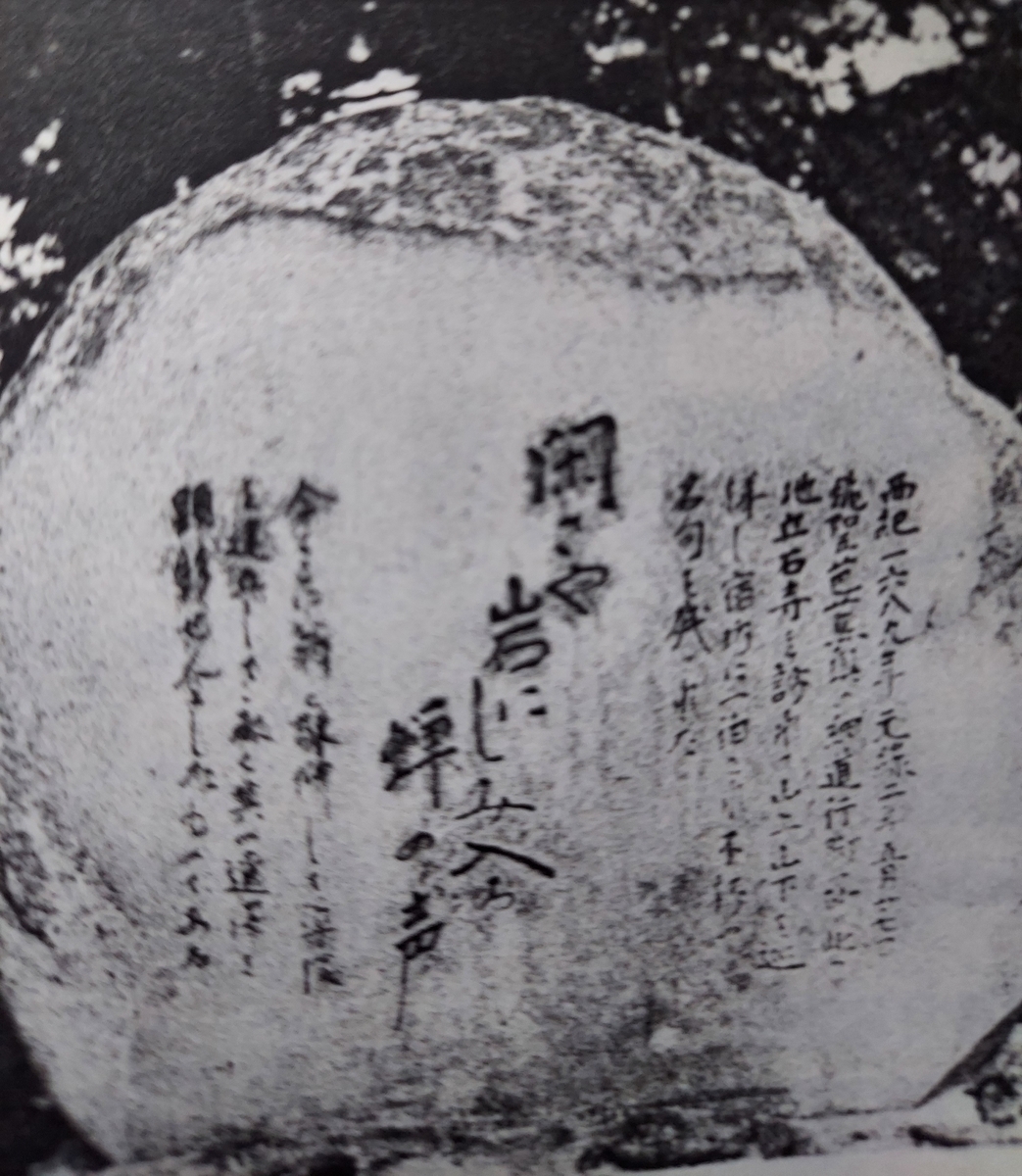 山形領に立石寺(りゅうしゃくじ)といふ山寺あり。慈覚大師の開基にして、ことに清閑の地なり。一見すべきよし、人々のすすむるによりて、尾花沢よりとつて返し、その間七里ばかりなり。日いまだくれず。麓の坊に宿かり置きて、山上の堂に登る。岩に巖を重ねて山とし、松柏年ふり、土石老て苔なめらかに、岩上の院々に扉を閉ぢて、物の音聞えず。岸をめぐり、岩を這て仏閣を拝し、佳景寂寞として心すみゆくのみおぼゆ。